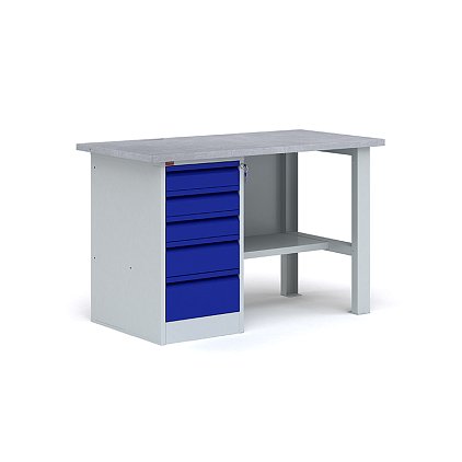 Верстак состоит из базовой рабочей зоны, а также тумбы с пятью ящиками. Преимущество использования данной модели заключается в возможности сортировать инструмент и детали по различным ящикам. Для текущих нужд используется нижняя верстачная полка.